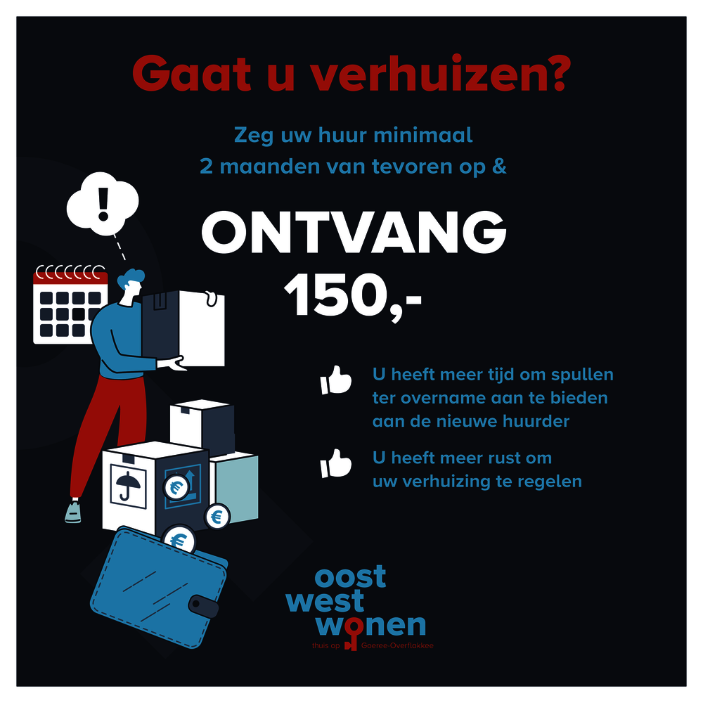 Tot nu toe kregen huurders €50 als ze de huur minimaal 2 maanden van tevoren opzegden. We verhogen deze vergoeding met ingang van 1 juli naar €150.
